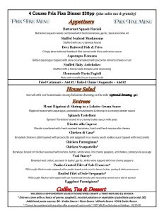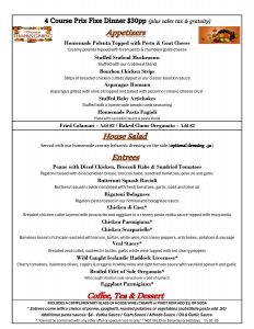 $30.00 Complete Dinner Menu (available Sunday to Friday) 4 Course Prix Fixe Dinner $30.00pp* Prix Fixe not available Saturdays or Holidays Available Sunday to Friday